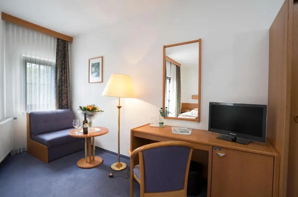 Sehr freundliches Personal, sehr schön renoviertes Zimmer, beim Frühstücksbuffet war alles frisch und viel Auswahl, nützliche Ausstattung im EG, Parkplatz vorhanden und praktisch gelegen, schöne Gartenanlage, und trotz Lage an der Straße war es im Zimmer mit Gartenblick absolut ruhig.